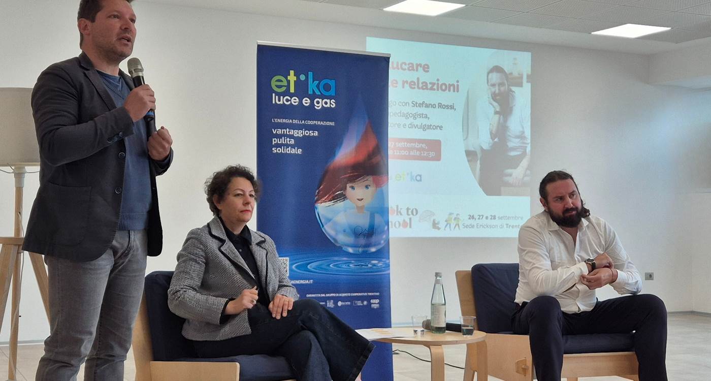 L’esperto nazionale,, che in questi anni ha formato 800 scuole e più di 100 mila genitori, è stato ospite della Book to School, la fiera organizzata da Erickson che si è svolta nel fine settimana a Trento, grazie a etika, l’offerta luce e gas conveniente, ecologica* e solidale di Dolomiti Energia ideata con il Gruppo cooperativo (Federazione Trentina della Cooperazione, Cassa Centrale Banca con le Casse Rurali Trentine, Famiglie Cooperative con il consorzio Sait Coop, Consolida e La Rete) riservata ai soci delle Famiglie Cooperative e ai soci e clienti delle Casse Rurali Trentine.